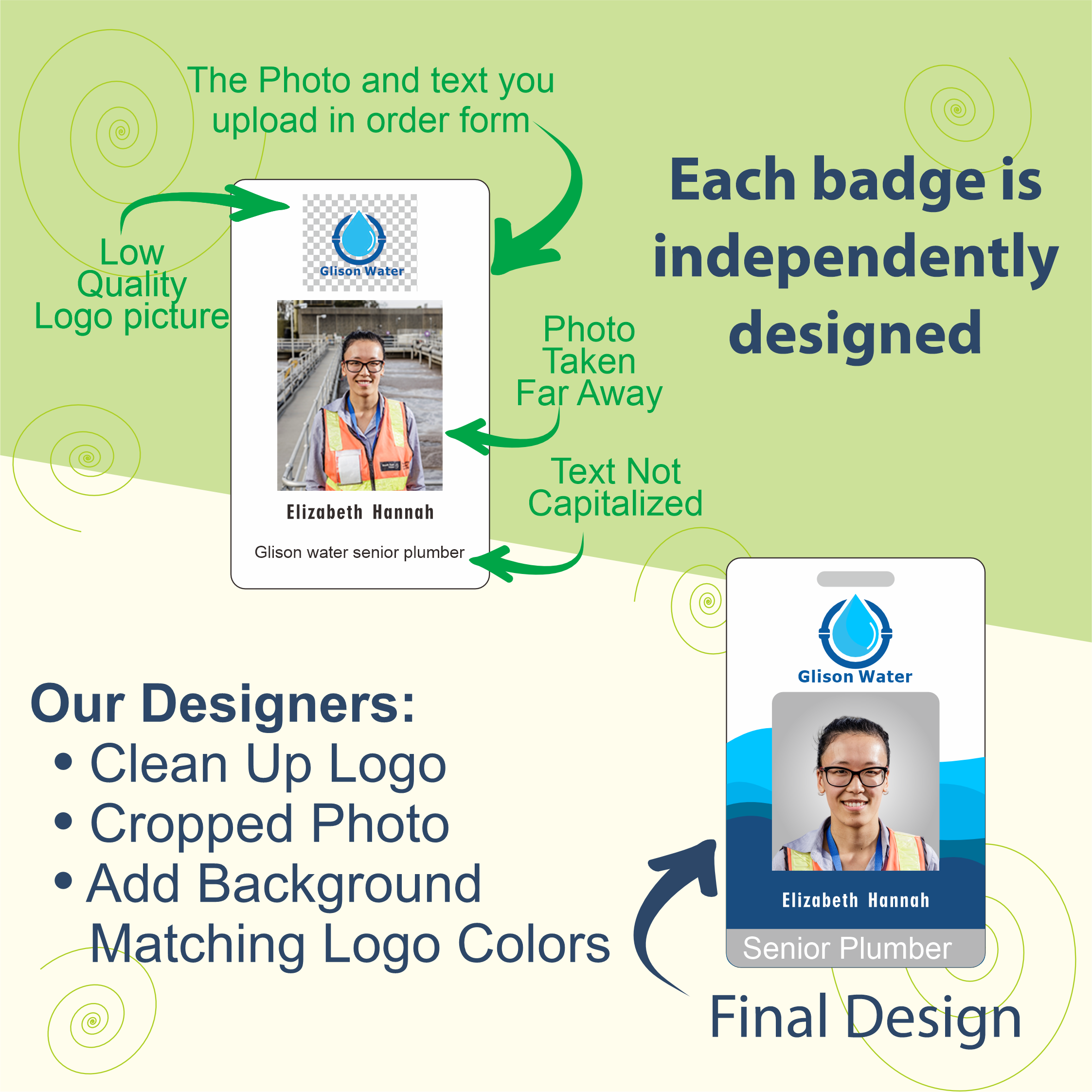 - Customized ID Badge Photo Card: Upload your favorite photo or enter your name, department, title, or company name on both sides of the badge by clicking the "Customize Now" button. It will be printed with the latest high-definition printing equipment.