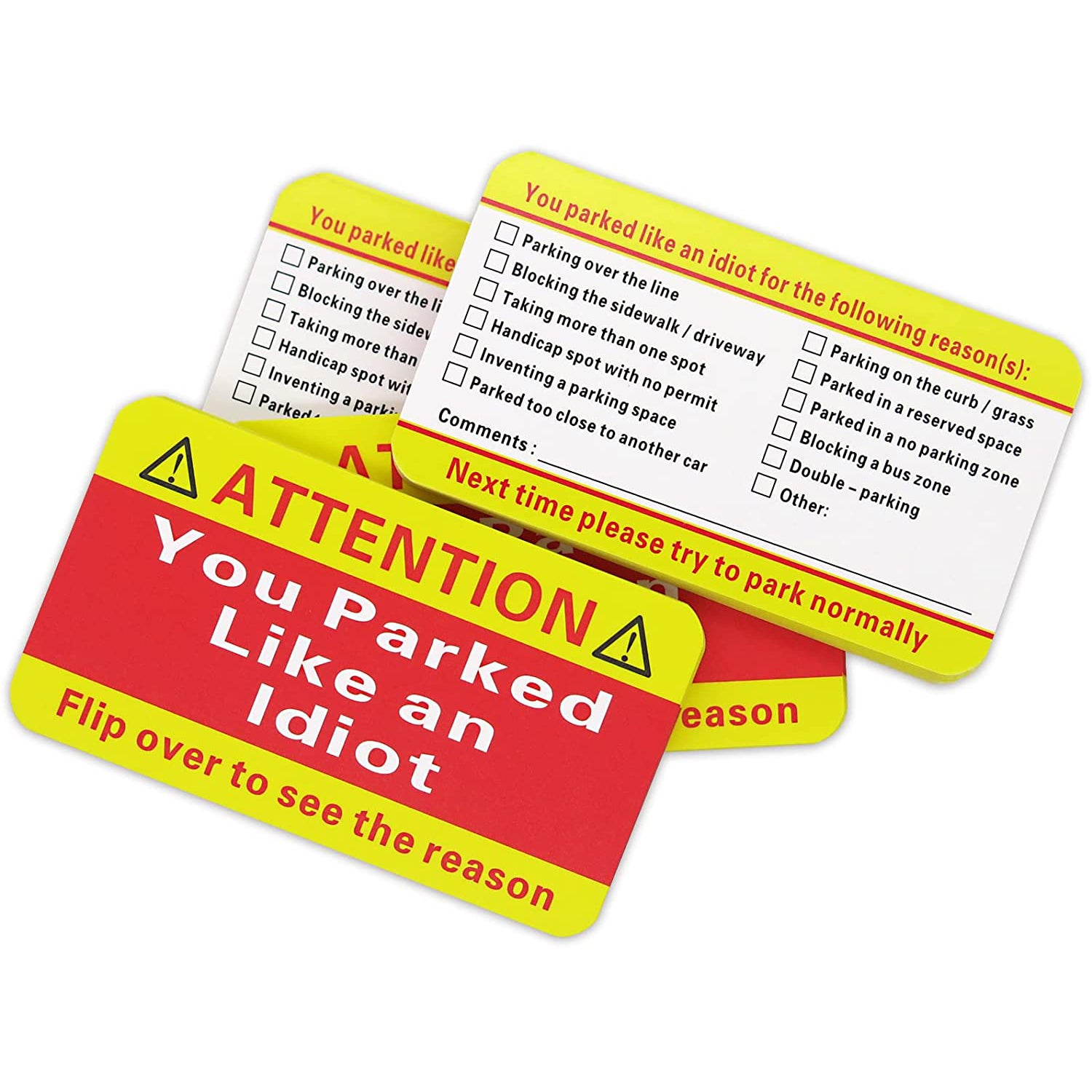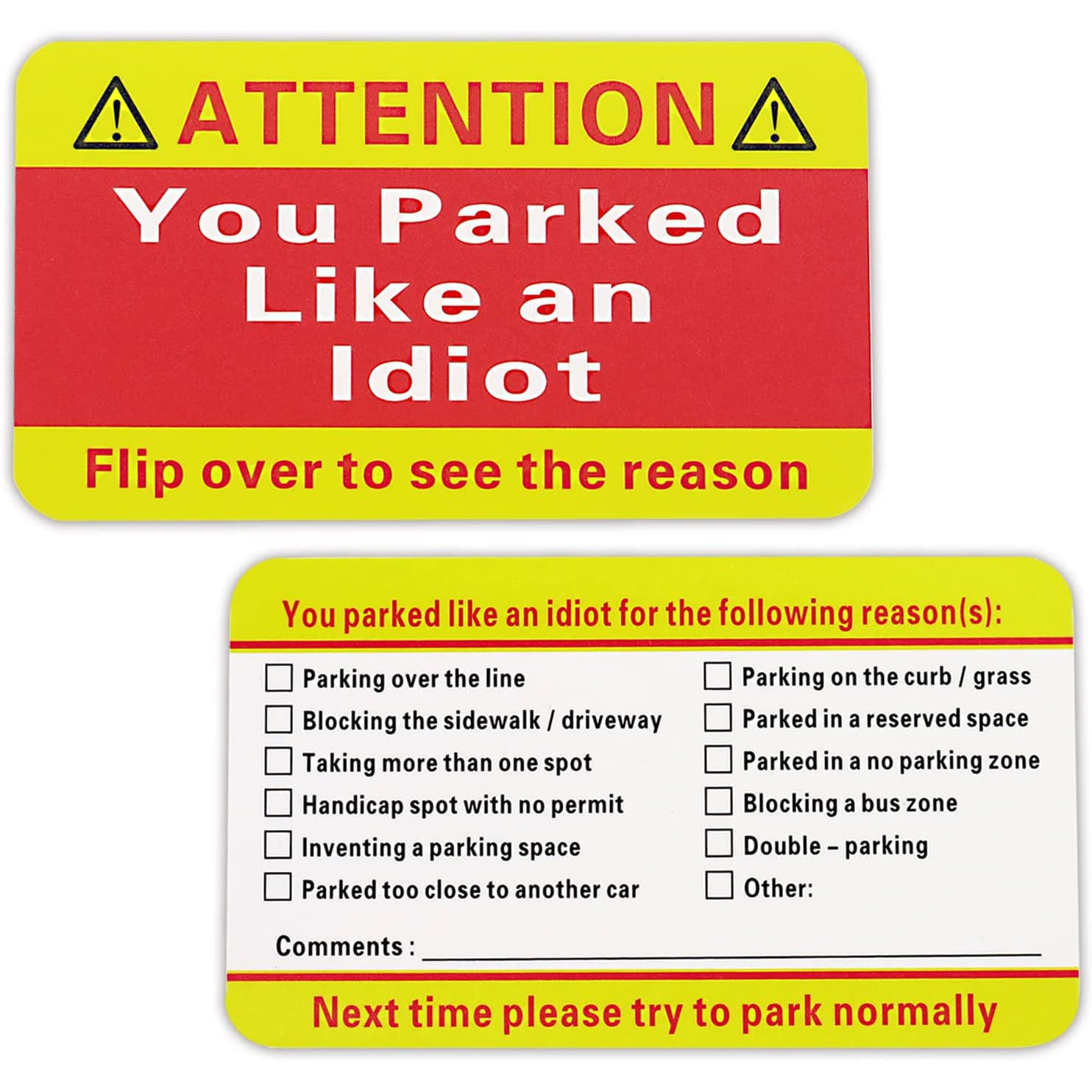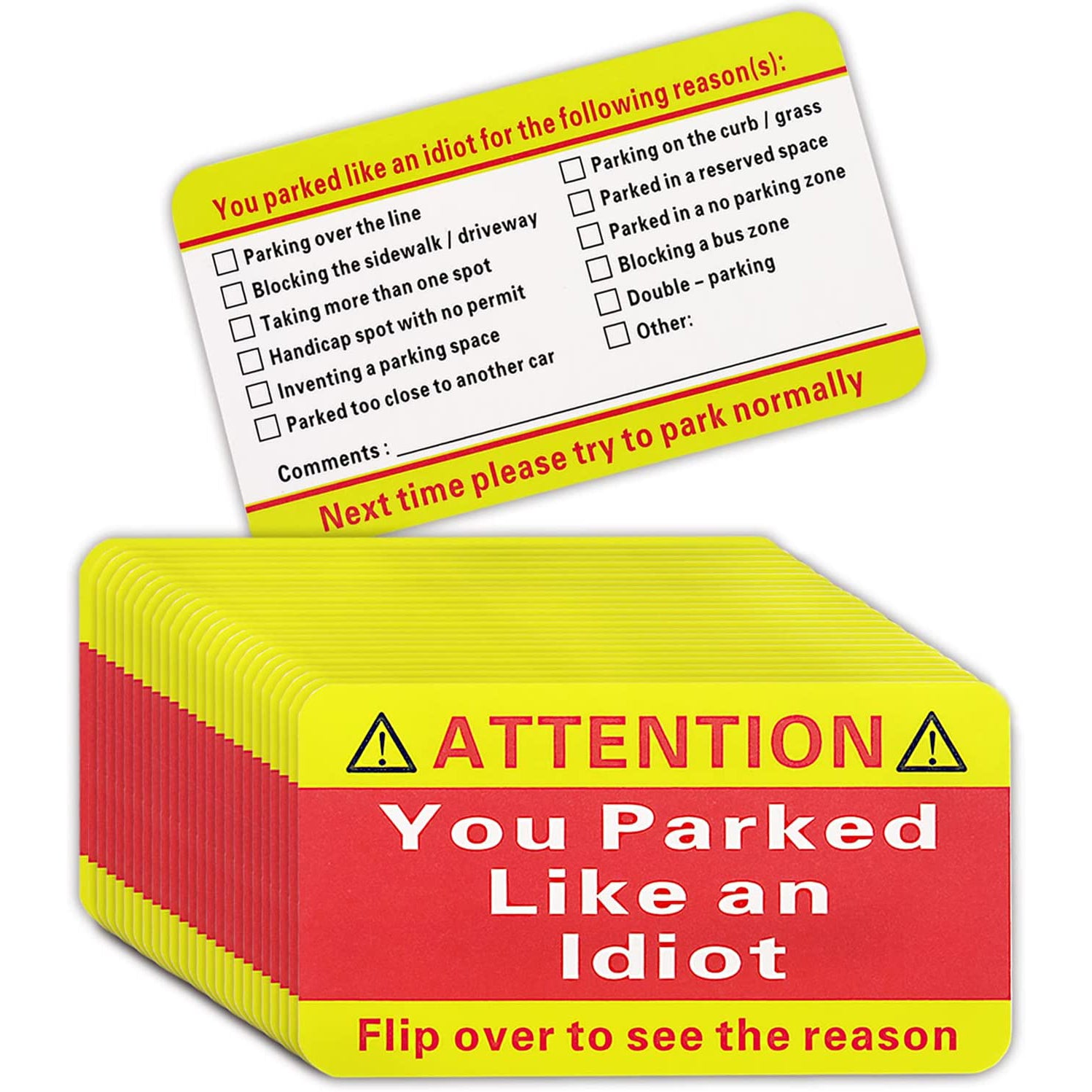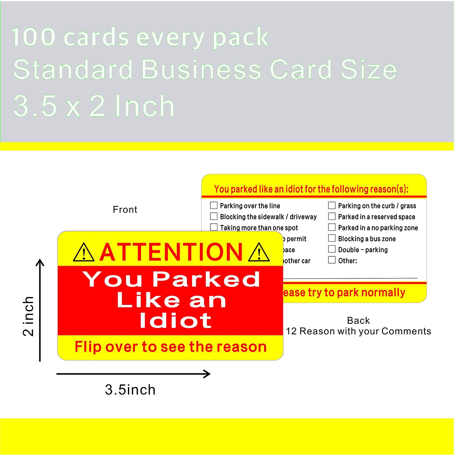 [Multi Reasons Notice] -- Multiple selections (12) on the back or write your comments to tell someone why they parked like an idiot for easy efficient vehicle parking area control.[100pack Every Order] -- 100 cards (business card size) in each order,Great way to tell someone You Suck at Parking.